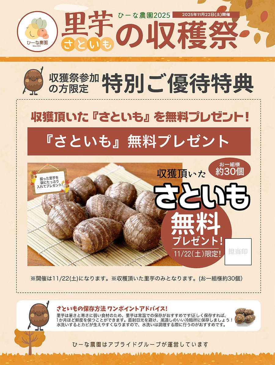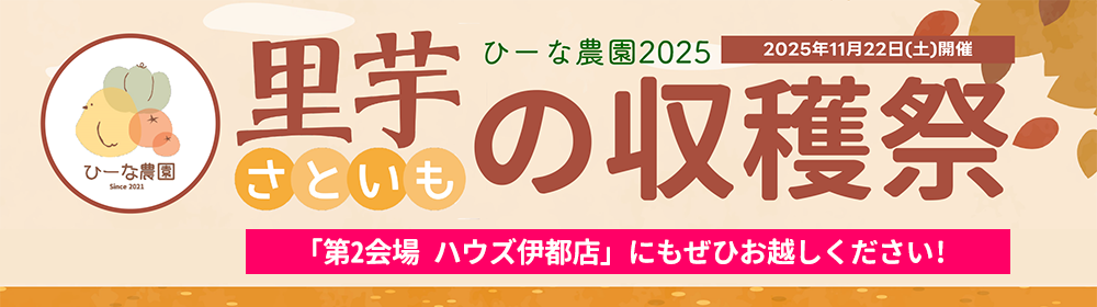 - NEW「さといもの収穫祭」特設サイトを公開致しました。11月4日より受付開始いたします!