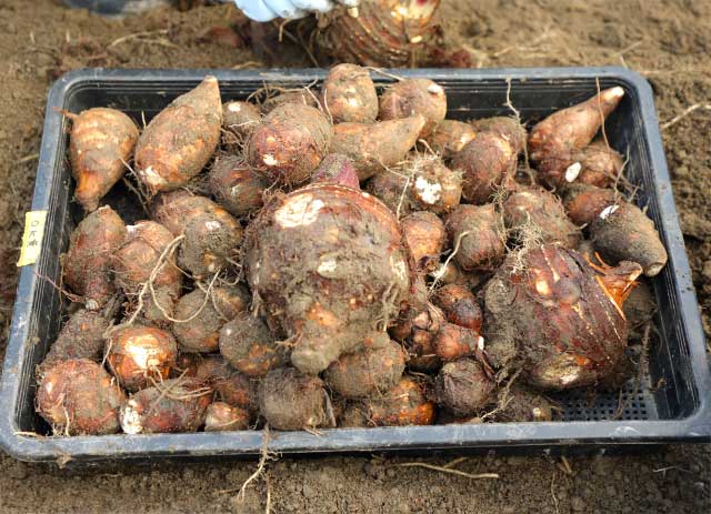 里芋は春に植え付けを行い、秋に収穫します。栽培期間は長いですが、どっさり収穫できます!新鮮な里芋ほど泥がついたまま皮が乾燥しておらず、しっとりと湿っています。また、皮にしま模様がくっきりと見え、ふっくらと丸みがあるものが美味しさの見分け方です。