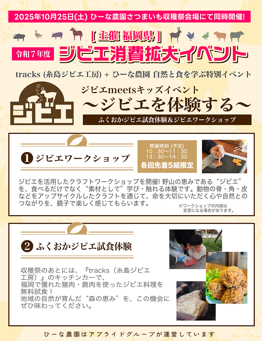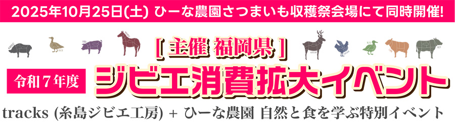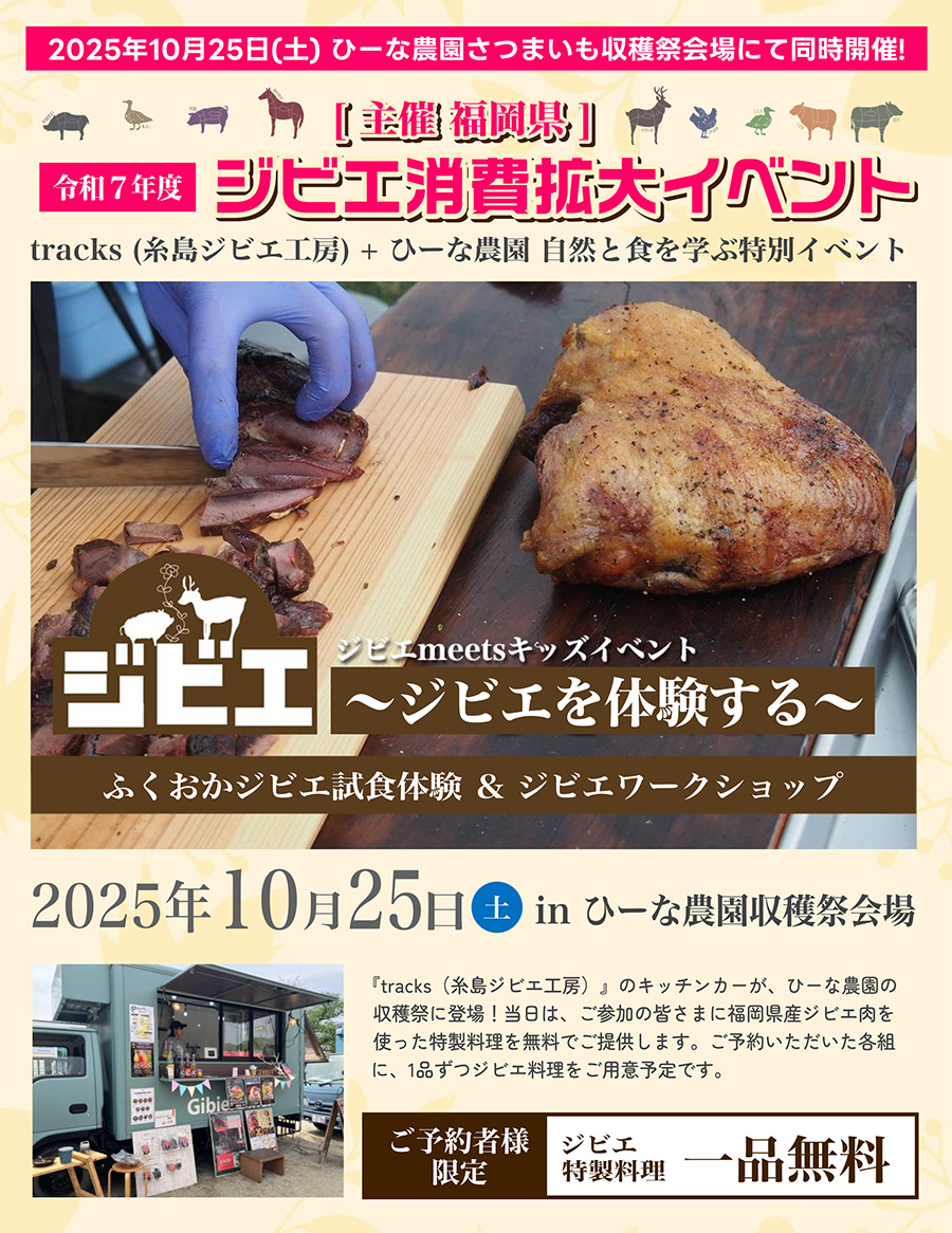 『tracks(糸島ジビエ工房)』のキッチンカーが、ひーな農園の収穫祭に登場!当日は、ご参加の皆さまに福岡県産ジビエ肉を使った特製料理を無料でご提供します。